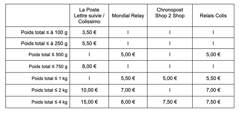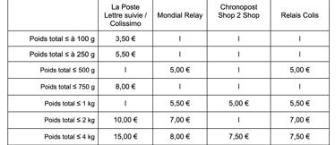 Modes de livraison : La Poste - Mondial Relay - Chronopost Shop2shop - Relais Colis - Click & Collect